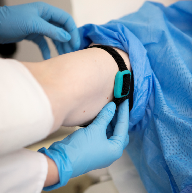 1. bezprzewodowego sensora temperatury o dokładności pomiarowej do setnych części stopnia Celsjusza umieszczonego w wygodnej opasce na ramię dla pacjentów