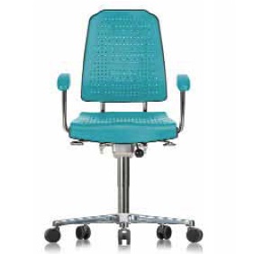 Klimastar: w pełni perforowane siedzenia i oparcia, maksymalny przepływ powietrza, optymalny komfort siedzenia, wymienne poduszki. WERKSITZ pokryte imitacją skóry są zgodne z DIN 53160: odporne na: płyny dezynfekujące, krew, mocz, ślinę, pot.