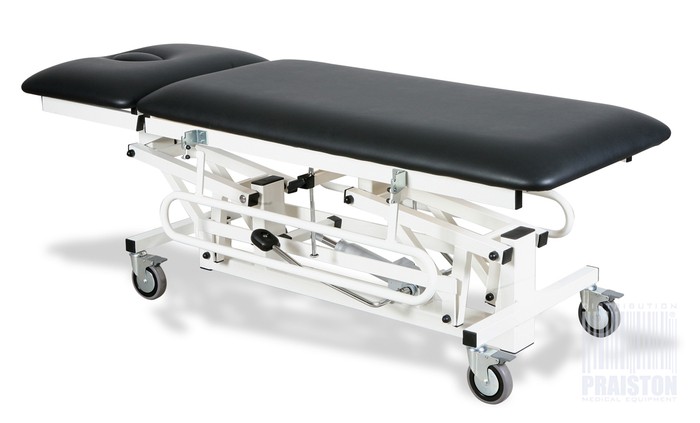 - PRA2HV1 - W standardzie występuje dwuczęściowe leże wykonane ze sklejki z węższym blatem w segmencie nożnym, Regulacja stołu odbywa się za pomocą siłownika hydraulicznego oraz posiada koła z układem hamulcowym,