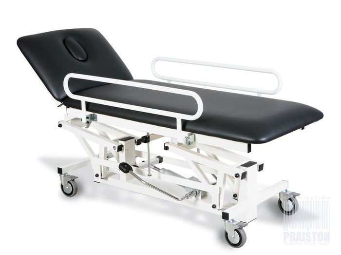 - PRA3HSS - W standardzie występuje trzyczęściowe leże wykonane ze sklejki oraz z dzielonym segmentem nożnym, Regulacja stołu odbywa się za pomocą siłownika hydraulicznego oraz posiada koła z układem hamulcowym,