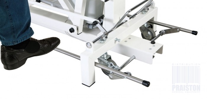 - PRA4EV1 - W standardzie występuje czteroczęściowe leże wykonane ze sklejki z węższym blatem w segmencie nożnym, Regulacja stołu odbywa się za pomocą siłownika elektrycznego oraz posiada koła z układem hamulcowym,