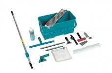Zestaw kompletny. Skład zestawu: wiadro do mycia okien 22l-zielone, sito - wyciskarkado wiadra, listwa z gumą do mycia okien 25 cm, listwa z gumą do mycia okien 35 cm, uchwyt do listwy bez przegubu, uchwyt do listw z przegubem, stelaż zmywaka do szyb 35 cm z przegubem, wkład bawełniany wzmocniony 35 cm do stelaża zmywaka, skrobaczka z rączką 13 (z 1 ostrzem), ostrza zapasowe 13 cm (10 szt), skrobaczka kiezonkowa 4 cm (z 5 ostrzami), kij teleskopowy 2x120 cm, adapter kątowy, microwit Soft-zielona, dozownik z płynem Vitronet.