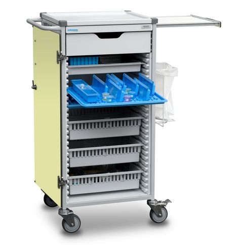 Wózek medyczny do transportu leków, na tace i pojemniki "MediDispenser". Specyfikacja: profilowany blat Sanitized ® pokryty jonami srebra, wysuwany blat roboczy, ergonomiczny uchwyt, szuflada umieszczona za drzwiami, prowadnice na tace MediDispenser, tace na materiały medyczne i zapas leków oraz pomoce podręczne pomoce pielęgniarskie, uchwyt na worki na odpady, obrotowy, drzwi zamykane na zamek.
