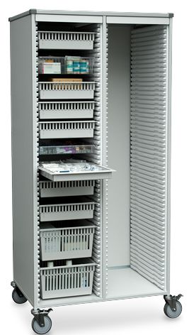 Podwjóna szafa transportowa. Profile ścienne do wsuwania kontenerów i koszy "SwissModul". Opcja z możliwością do pracy po obu jej stronach. Z zamykanymi drzwiami z przodu i/lub z tyłu. Antystatyczne koła.