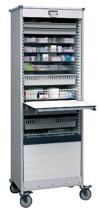 Wózek do transportu i przechowywania materiałow z roletami. Profile ścienne do wsuwania kontenerów i koszy "Swiss Modul". Roleta, z opcją zamykania. Z wysuwanymi do przodu, blatem roboczym.