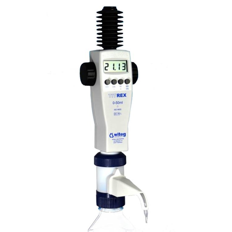 Cyfrowa biureta TITREX to bardzo dokładne i precyzyjne urządzenie. Przeznaczona jest przede wszystkim do szybkiego dozowania w objętości po 10 µl. Odporna na większość kwasów i zasad. Głowica zaworu łatwa w demontażu i utrzymaniu w czystości.