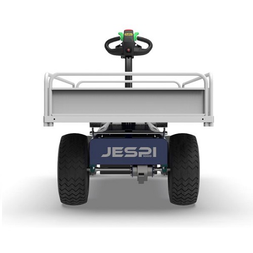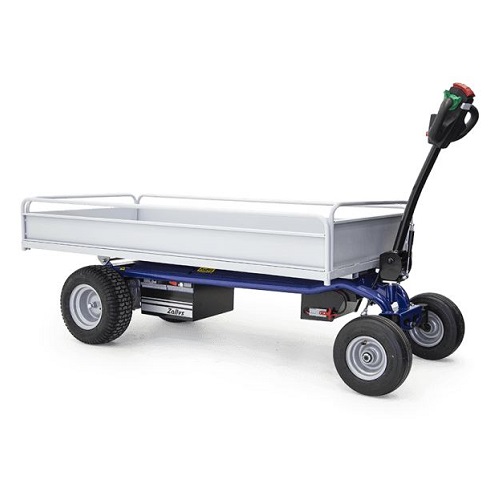 Wózek z napędem Zallys Jespi L z 4 kołami i platformą ładunkową ułatwia przenoszenie ładunków i może być używany jako podwozie elektryczne do przewożenia innego sprzętu.