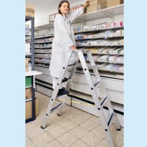 Drabina, na którą można wchodzić z obydwu stron – nadają się również do zastosowania w pracowniach rezonansu magnetycznego. Posiada technologię bezpiecznych stopni ZARGES z okrawędziowaniem.