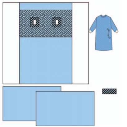 Chirurgiczne obłożenia barierowe Alpha-Tex występują tylko w wersji wyjałowionej. Elementy i całe zestawy są pakowane w opakowania typu Tyvec-folia zgodne z wymogami normy EN ISO 11607:2006. Wyroby Alpha-Tex są sterylizowane radiacyjne w zwalidowanym procesie sterylizacji zgodnym z wymogami normy EN ISO 11137-1:2006. Zestaw składa się z: 1 x serweta na stolik 100 x 150 cm, 1 x serweta 2-warstwowa 100 x 150 cm, 1 x dwustronna serweta do angiografi i udowej 220 x 320 cm z dwoma samoprzylepnymi otworami 6 x 8 cm, 1 x fartuch chirurgiczny rozmiar XL, 1 x taśma przylepna 10 x 25 cm.