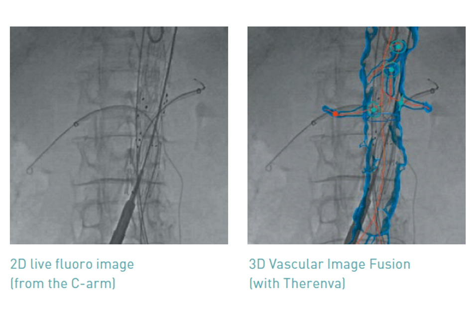 Mobilny system fuzji obrazów Therenva EndoNaut® daje specjalistom precyzję podczas wymagających procedur hybrydowych. Połączenie przedoperacyjnego skanu CT wraz ze śródoperacyjnym obrazowaniem na nawigacji naczyniowej Therenva EndoNaut® daje większą pewność podczas procedury przy zauważalnie zmniejszonej dawce promieniowania oraz ilości użytego kontrastu.