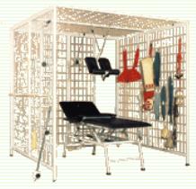 kabina o wymiarach 2x2 m. Kabiny do ćwiczeń i zawieszeń stosuje się głównie na oddziałach rehabilitacji w lecznictwie zamkniętym. Dają one możliwość wykonania podwieszenia całkowitego, ćwiczeń biernych, redresji, ćwiczeń samowspomaganych, czynnych w odciążeniu oraz czynnych z dawkowanym oporem. Przy zastosowaniu dodatkowego wyposażenia możliwe jest wykonanie wyciągów kręgosłupa w różnych pozycjach. Kabina do ćwiczeń i zawieszeń zbudowana jest z ośmiu prostokątnych ram, wypełnionych prętami tworzącymi siatkę o prostokątnych oczkach. Po zmontowaniu stanowi otwarty z jednej strony prostopadłościan. Elementy konstrukcyjne kabiny umożliwiają zestawienie jej w różne kombinacje. Istnieje możliwość wymiany jednej lub więcej ram i zastąpienie jej na przykład drabinką. Ramy kraty wykonane są z kształtowników, wypełnione prętami stalowymi, łączone w sposób trwały. Całość pokryta jest białym lakierem nałożonym metodą proszkową.