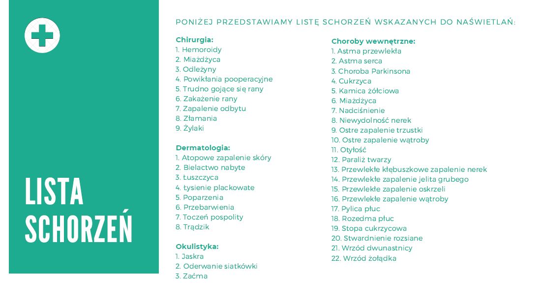 Wykaz schorzeń do naświetlania znajduje się w zakładce Schorzenia. www.SzybkieLeczenie.PL