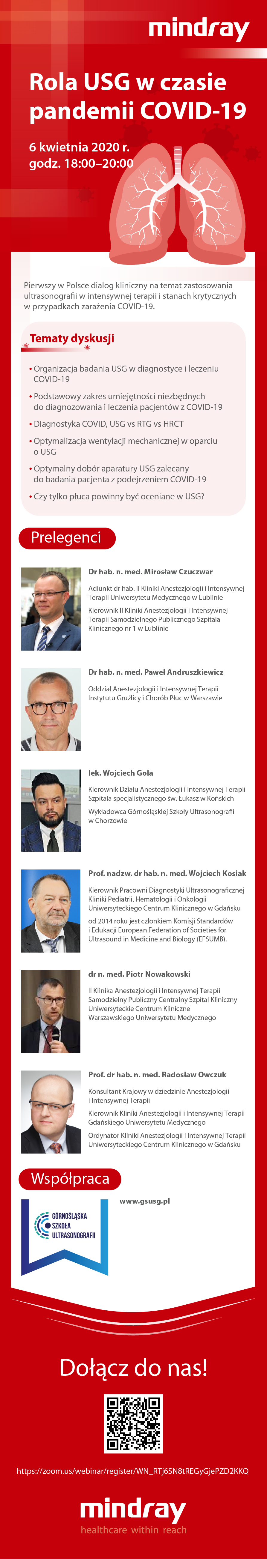 Serdecznie zapraszamy na pierwszy w Polsce dialog kliniczny Mindray, na temat roli USG w czasie pandemii COVID19. Webinarium poprowadzą wybitni polscy specjaliści w dziedzinie anestezjologii i intensywnej terapii oraz diagnostyki ultrasonograficznej.