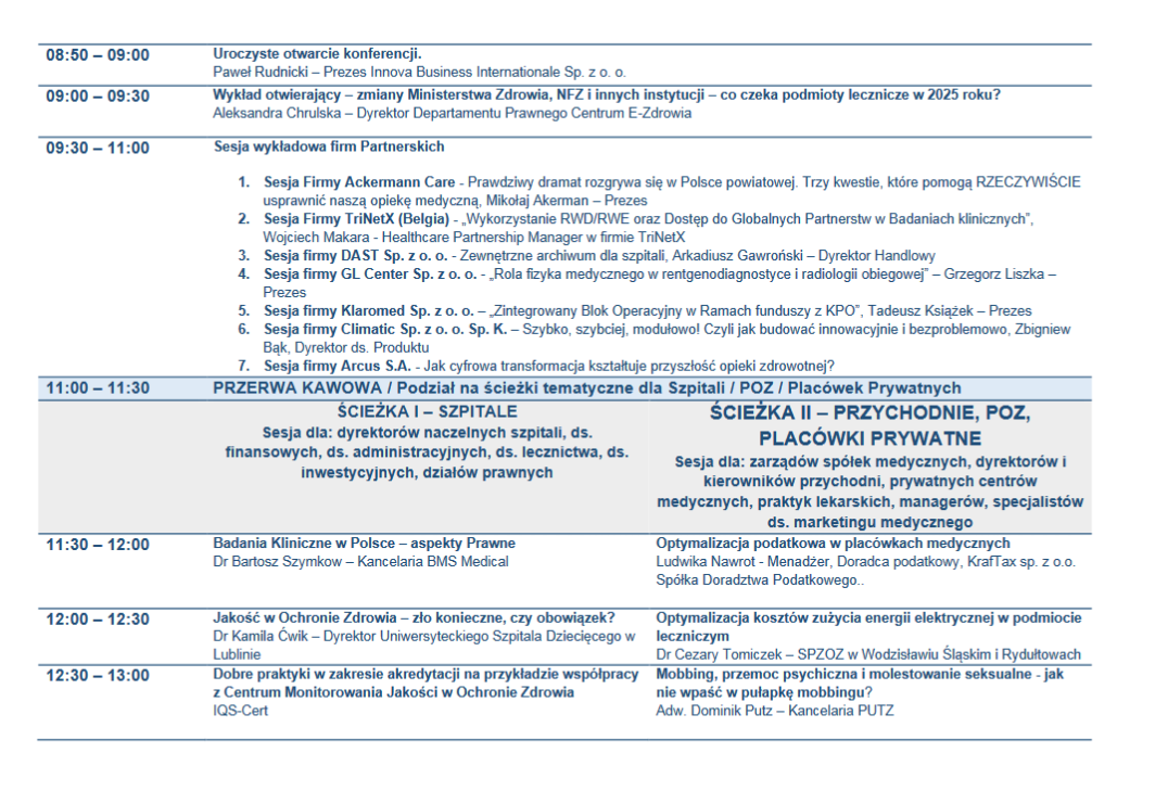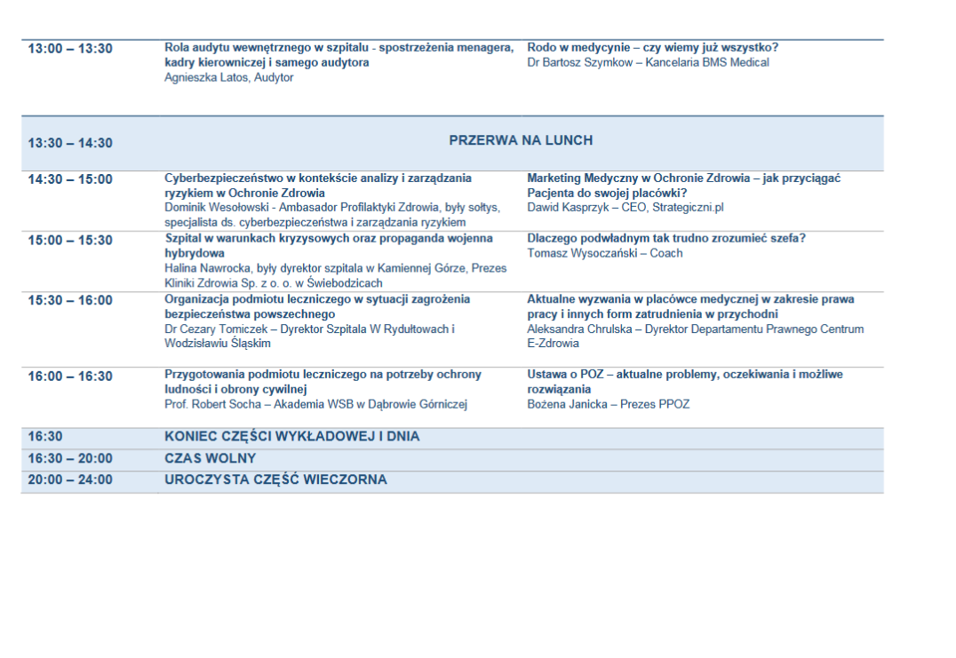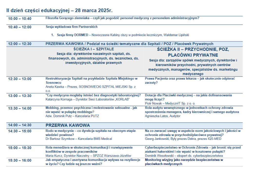 Edycja Karpacka to ponad 25 prelegentów - wybitnych i uznanych autorytetów w Ochronie Zdrowia. Konferencja podzielona tym razem będzie na sesje tematyczne - I sesja dla Szpitali - dyrektorów szpitali (naczelnych, technicznych, administracyjnych, finansowych, ds. lecznictwa. ds. inwestycji, ds. infrastruktury) oraz II sesja dla przychodni i prywatnych placówek (zarządów spółek medycznych, managerów, dyrektorów, kierowników etc.)