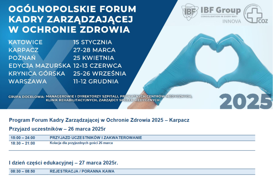 Ogólnopolskie Forum Kadry Zarządzającej w Ochronie Zdrowia to szereg spotkań, które dedykowane są dla szeroko pojętej kadry zarządzającej - zarówno szpitalami jak również prywatnymi centrami medycznymi, dla zarządów spółek medycznych, dyrektorów SPZOZ, przychodni, zakładów rehabilitacyjnych etc. To już X edycja cyklu, która zbiera co raz większą rzeszę uczestników z branży medycznej, a głównym celem jest integracja środowiska kadry zarządzającej podmiotami leczniczymi każdego rodzaju.