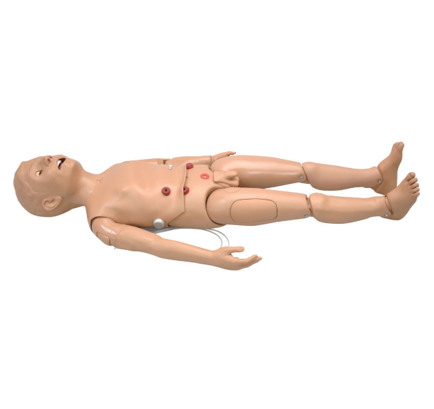 Manekin pediatryczny przedstawia dziecko w wieku 5 lat posiadające w pełni ruchomą głowę i szczękę z zębami i językiem oraz realistyczną pracę klatki piersiowej, która zawiera żebra, płuca i serce.