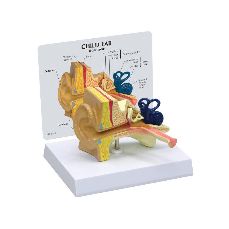 1019528 to powiększony model ucha dziecięcego o pełnym rozmiarze, który przedstawia półkoliste kanały i ślimak ucha wewnętrznego, kostki słuchowe,zapalenie ucha środkowego (zapalenie i symulowany płyn w uchu środkowym), błonę bębenkową, a także mięśnie bębenkowe. Model przedstawia również poziomą trąbkę słuchową Eustachiusza, typową dla dziecka.