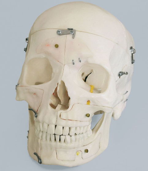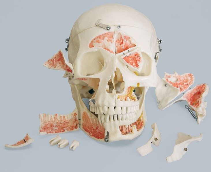 Czaszka dorosłego człowieka wyposażona w ruchomą żuchwę z możliwością demontażu oraz prezentacji korzeni zębów. Przekrój horyzontalny prezentuje jamę czaszki, wewnątrz której kolorem oznaczono przebieg naczyń oponowych, zatoki żylnej i tętnicy szyjnej wewnętrznej. Przekrój strzałkowy przedstawia jamę nosową, zatokę czołową i nosową. W modelu można zdemontować kość skroniową i zaprezentować ucho wewnętrzne.
