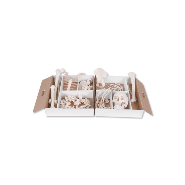 Połowa Rozmontowanego Szkieletu Ludzkiego zawiera 3 częściową czaszkę, połączone drutem kości rąk i nóg, mostek, żebra, kości gnykową oraz kości kręgowe. Model dostarczany jest w wytrzymałym, podzielonym na rubryki pudełku kartonowym.