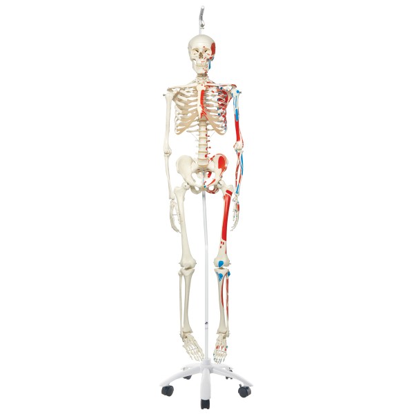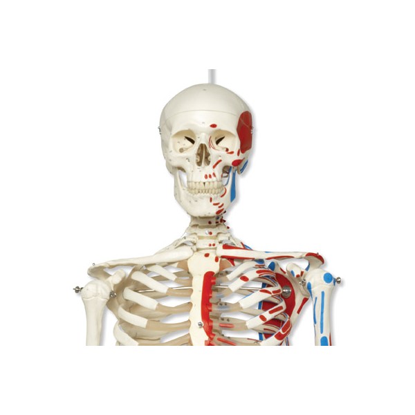 Szkielet Max A11/1 z malowaniem przyszczepów mięśniowych wiszący na statywie posiada wszystkie cechy wysokiej jakości modeli 3B Scientific i dodatkowo przedstawia wzajemne oddziaływanie strukturalne kości i mięśni (ponad 600 namalowanych miejsc przyczepów mięśniowych).