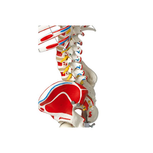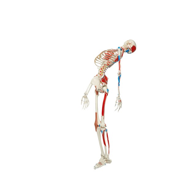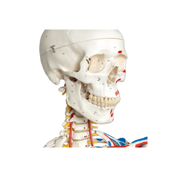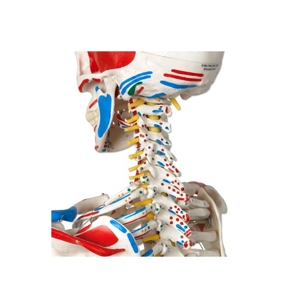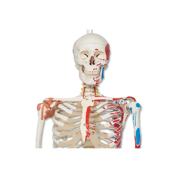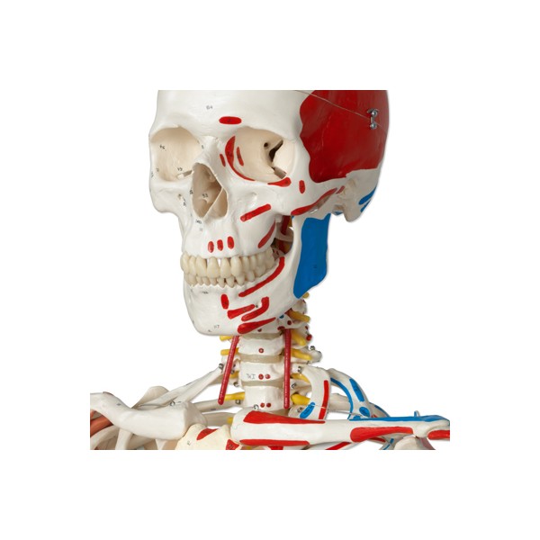 Szkielet luksusowy Sam A13/1 WISZĄCY NA STATYWIE Szkielet Sam A13/1 jest modelem luksusowym w wersji high-end i posiada wszystkie zalety modeli 3B Scientific. Jest to połączenie Max i Leo z elastycznym kręgosłupem. Sam umożliwia demonstrację ruchów czaszki i stawów głowy jak również wszystkich naturalnych postaw dzięki w pełni elastycznemu kręgosłupowi. Dzięki wyjątkowym cechom takim jak: elastyczny kręgosłup, miejsca przyczepów mięśni, numeracja kości, elastyczne więzadła stawów, wypadający dysk między 3 i 4 kręgiem kręgosłupa i przedstawienie ponad 600 struktur anatomicznych, Szkielet Sam Deluxe jest w niewątpliwe jedną z najlepszych profesjonalnych pomocy anatomicznych. Szkielet Sam wykonany jest z nietłukącego tworzywa sztucznego wysokiej jakości. Wyprodukowany w Niemczech, co jest gwarancją wysokich standardów produkcji. Model wiszący na statywie.