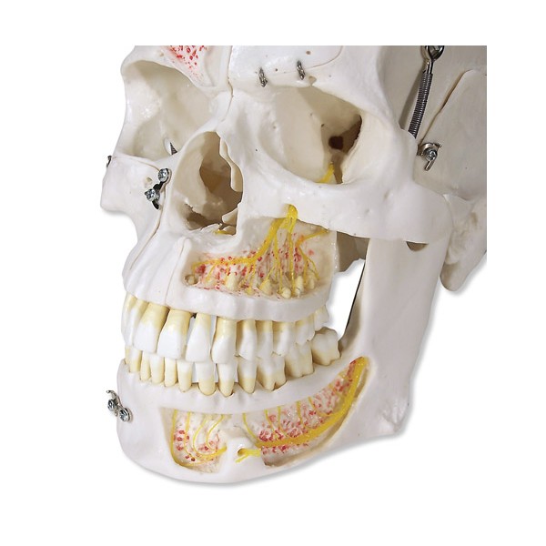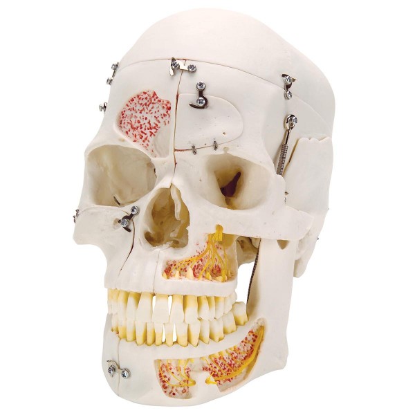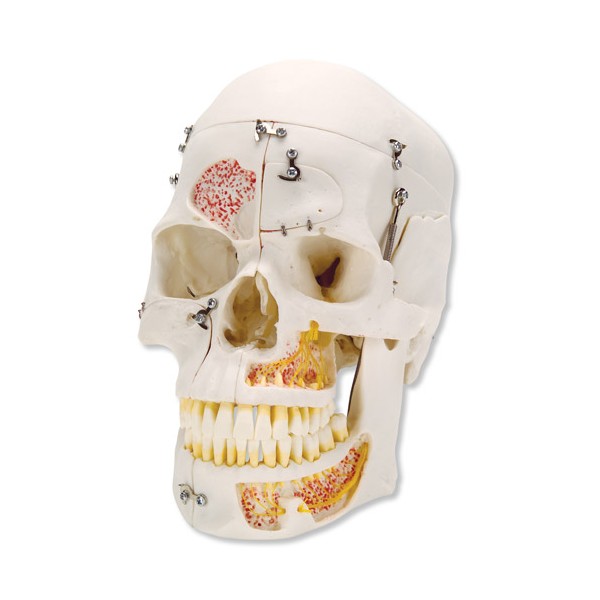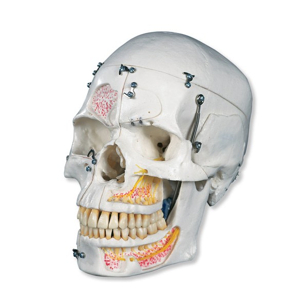 Model 10-częściowy ze zdejmowanym sklepienie czaszki. Podstawa dzielona w płaszczyźnie strzałkowej. Możliwość wyciągania pojedynczych zębów.