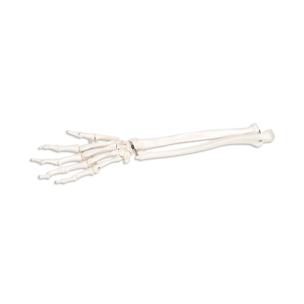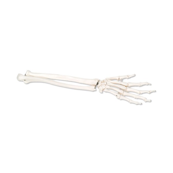Elastyczny szkielet ręki przedramieniem prezentuje kości ręki, które są połączone za pomocą żyłki nylonowej oprócz kości łokciowej i promieniowej, które są połączone za pomocą drutu