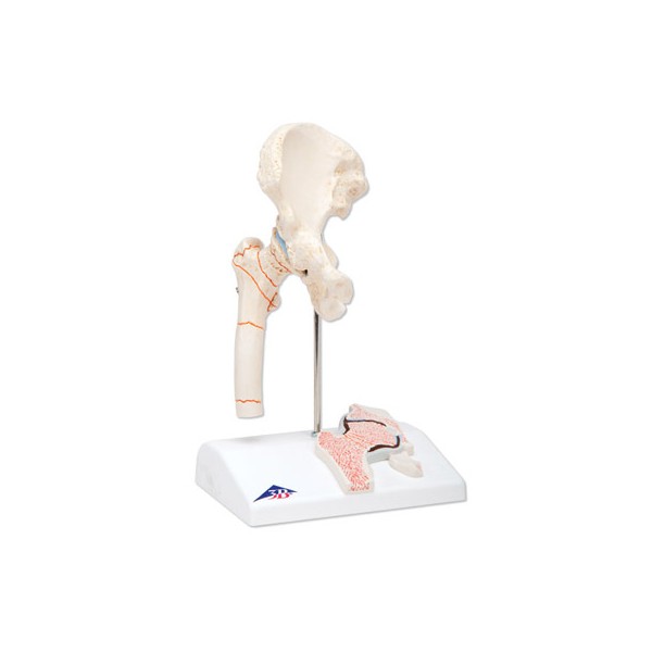 Model stawu biodrowego ze złamaną kością udową osoby starszej w skali 1/2 naturalnej wielkości. Poza anatomią stawu biodrowego zaprezentowano przedni przekrój szyjki kości udowej. Replika przedstawia złamanie kości udowej, które w praktyce najczęściej występuje, jak również typowe zużycie eksploatacyjne stawu, np. choroba zwyrodnieniowa stawu biodrowego oraz koksartroza.