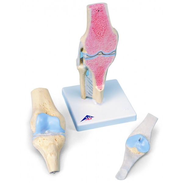 Model naturalnej wielkości przedstawia zdrowy, prawy staw kolanowy w pozycji wyprostowanej. Umożliwia on demonstrację różnych zaburzeń stawu kolanowego oraz sposobów ich leczenia. Staw kolanowy składa się z fragmentu kości udowej, piszczelowej i strzałkowej, a także więzadeł i rzepki z częścią ścięgna udowego. Rzepka wraz z załączonym ścięgnem oraz przednia połowa stawu kolanowego (w przekroju czołowym) mogą być odłączone od modelu w celu odsłonięcia struktur wewnętrznych. Model zamontowany na podstawie.
