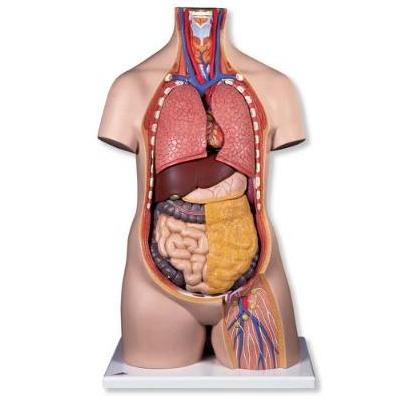 Model torsu składa się następujących, wyjmowanych części: • serce- 2 częściowe, • płuca, • żołądek, • wątroba z pęcherzykiem żółciowym, • przewód pokarmowy- 2 częściowy, • przednia część nerki. Specyfikacja techniczna: wymiary: 70x38x25 cm, masa: 4,1 kg.