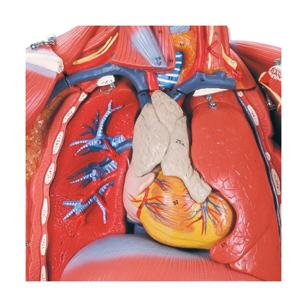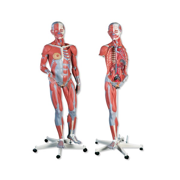 Model mięśniowy Delux B50 to wysoki na 138 cm model, który przedstawia obraz powierzchniowej i wewnętrznej struktury mięśni, w szczegółowy sposób prezentuje główne nerwy, naczynia i narządy. Aż 45 części może być demontowanych, co pomoże Tobie lepiej zrozumieć podstawowe funkcje ludzkiego ciała. Gdy zdejmiesz sklepienie czaszki, zobaczysz wówczas 3 ruchome części mózgu. Pod wątrobą znajdziesz pęcherzyk żółciowy i drogi żółciowe. Opisywany model umożliwia obserwację płuc, żołądka, serca i nerek. Dostarcza szczegółowego widoku aż 13 różnych mięśni rąk i nóg! Do modelu załączone są narządów płciowe męskie i żeńskie, włącznie z gruczołami sutkowymi oraz szczegółowy podręcznik z nazwą ponad 600 anatomicznych detali. Ręcznie malowany, zmontowany na praktycznym statywie na kółkach.