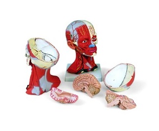 Głowa mięśniowa z szyją szczegółowo przedstawia mięśnie powierzchowne, mięśnie głębokie, nerwy oraz naczynia. Model można rozmontować na pokrywę czaszki i 3 częściowy mózg.