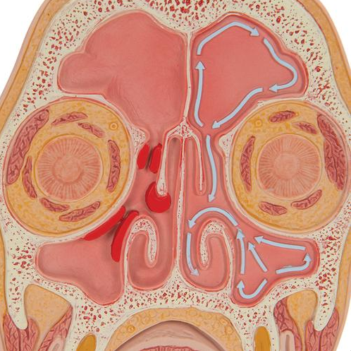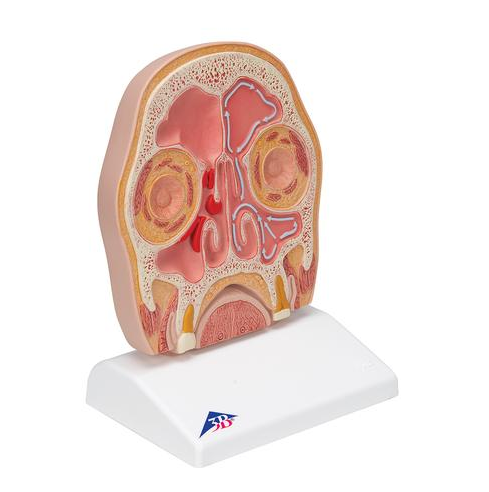 Model przekroju głowy przez zatoki to niezwykle szczegółowy model dostarczany na podstawie. Replika przekroju głowy przez zatoki przynosowe przedstawia oznaki zapalenia zatok (zapalenie zatoki przynosowej) z prawej strony, natomiast lewa strona przedstawia zdrowe i drożne zatoki.