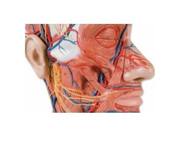 Model połowy głowy z umięśnieniem dostarczany jest ze statywem, umożliwiającym łatwe prezentowanie go w klasie lub gabinecie lekarskim. Wszystkie istotne struktury anatomiczne zostały przedstawione.