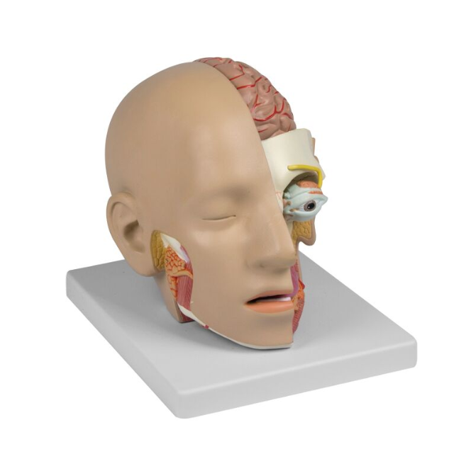 Model głowy 4 częściowy naturalnej wielkości, gdzie lewa strona twarzy przedstawiona jest w przekroju strzałkowym i horyzontalnym.