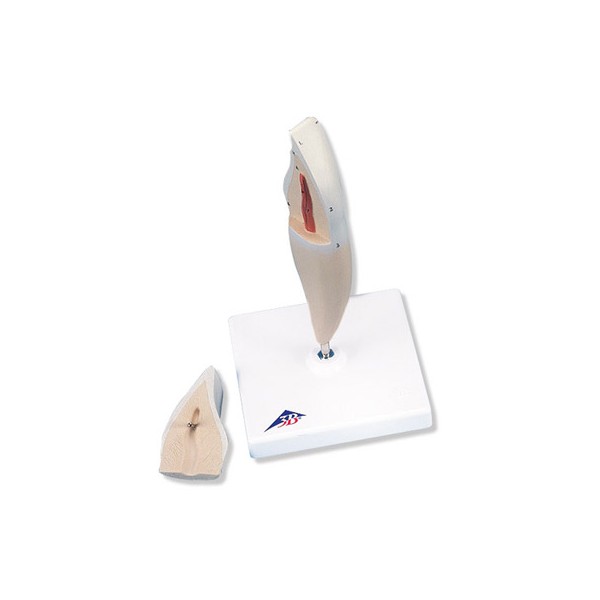 Dwuczęściowy model dolnego siekacza zaprezentowany jest w przekroju podłużnym.