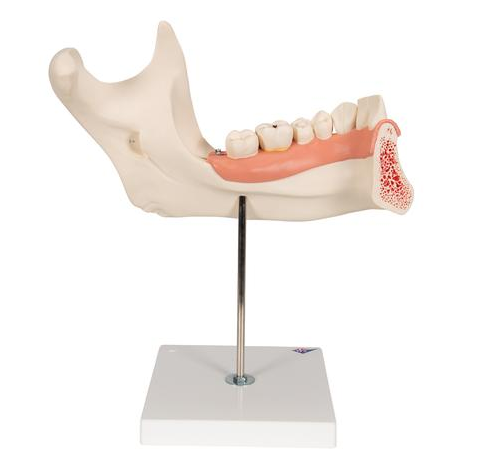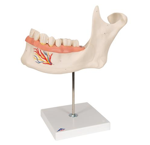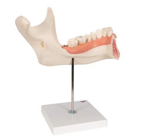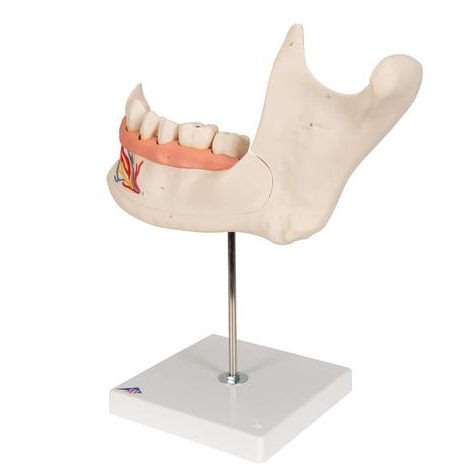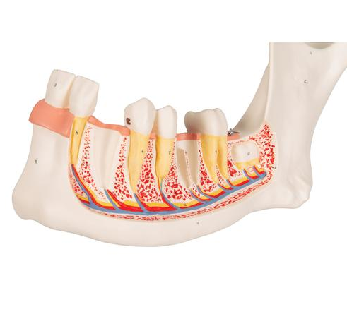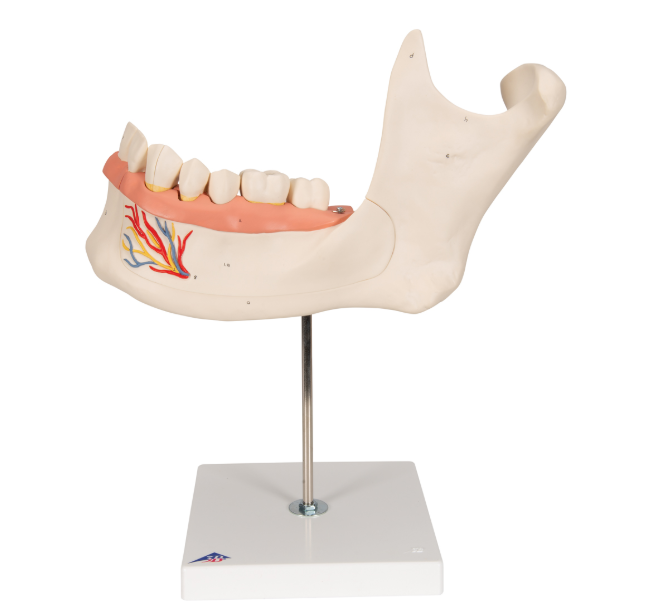 Model Połowy Dolnej Szczęki gdzie zdemontować można część kości, dzięki czemu będzie wgląd w zęby z korzeniami, nerwami i naczyniami. dostarczany na podstawie co umożliwia jeszcze lepszą ekspozycję.