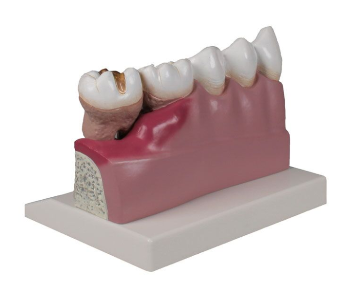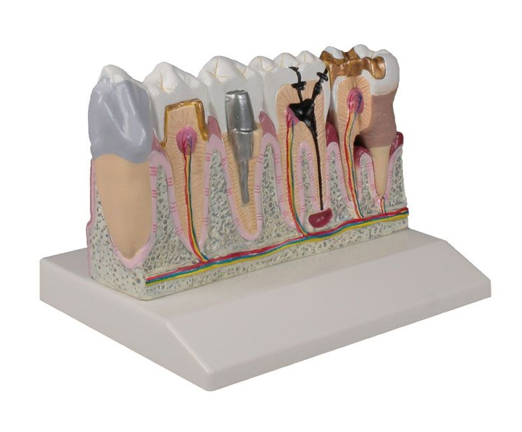 Model zębów 4 krotne powiększenie obrazuje prawą stronę dolnej szczęki z zębami od 3 do 7 ze zmianami chorobowymi i sposobami leczenia. Odwzorowane są anatomiczne struktury takie jak: kość szczęki, nerwy, naczynia krwionośne, więzadła, szkliwo, zębina i miazga.