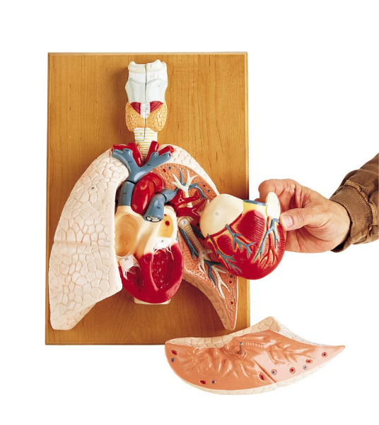 Przedstawia następujące organy prawidłowo anatomicznie umiejscowione: płuca, tchawicę, serce, przełyk, krtań ze strunami głosowymi. Ponadto usunąć można prawą połowa krtani, płuca oraz serce.
