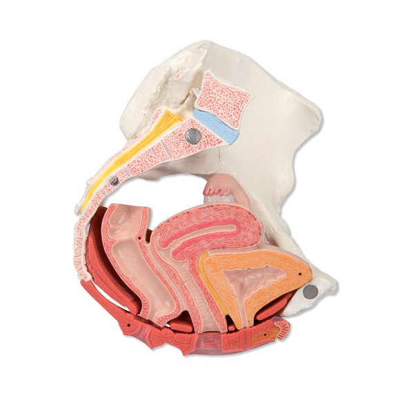 Miednica żeńska z więzadłami i mięśniami H20/3 oraz strzałkowym przekrojem wzdłuż mięśni dna miednicy. Model 4-częściowy bardzo realistycznie odwzorowuje nawet najmniejsze detale anatomiczne.
