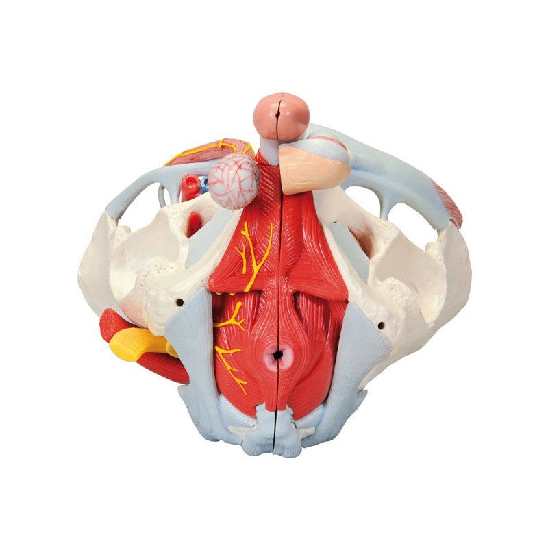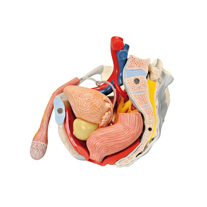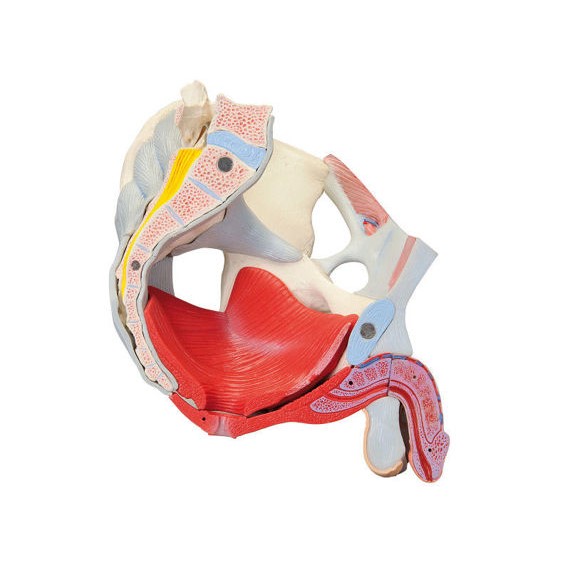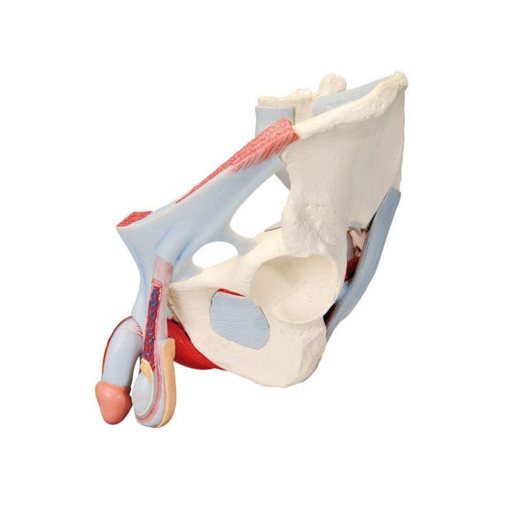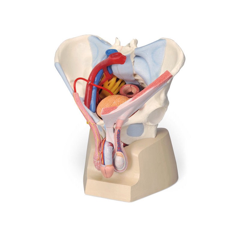 H21/2 to 7-częściowy model miednicy męskiej z więzadłami, naczyniami, nerwami, przeponą miednicy i zewnętrznymi narządami płciowymi. Poszczególne części modelu można rozmontowywać.