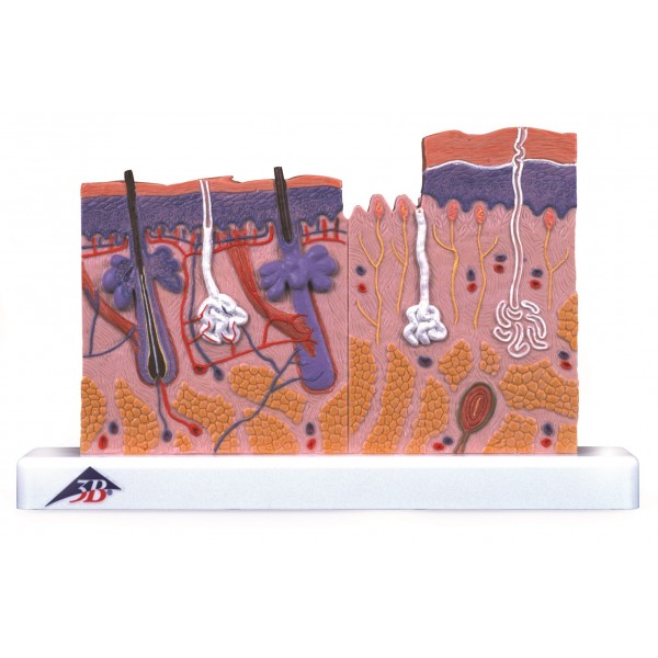 Przekrój skóry zapewnia szczegółowy wgląd w budowę skóry, uwidaczniając takie elementy jak meszki włosowe, gruczoły łojowe, gruczoły potowe, receptory, nerwy oraz naczynia. Jest to doskonałe narzędzie do demonstracji anatomii ludzkiej skóry. Model dostarczany na podstawie.