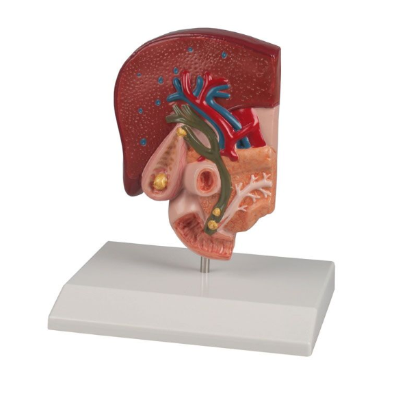 Model dróg żółciowych z kamicą żółciową na podstawie. Replika przedstawia zmiany chorobowe spowodowane przez przewlekłe stany zapalne oraz ostre stany zapalne (zapalenie pęcherzyka żółciowego) na ścianie pęcherzyka żółciowego. Kamienie żółciowe przedstawione są w fałdzie spiralnym, dnie pęcherzyka żółciowego, przewodzie żółciowym, otworkach brodawkowych i w jelicie cienkim.