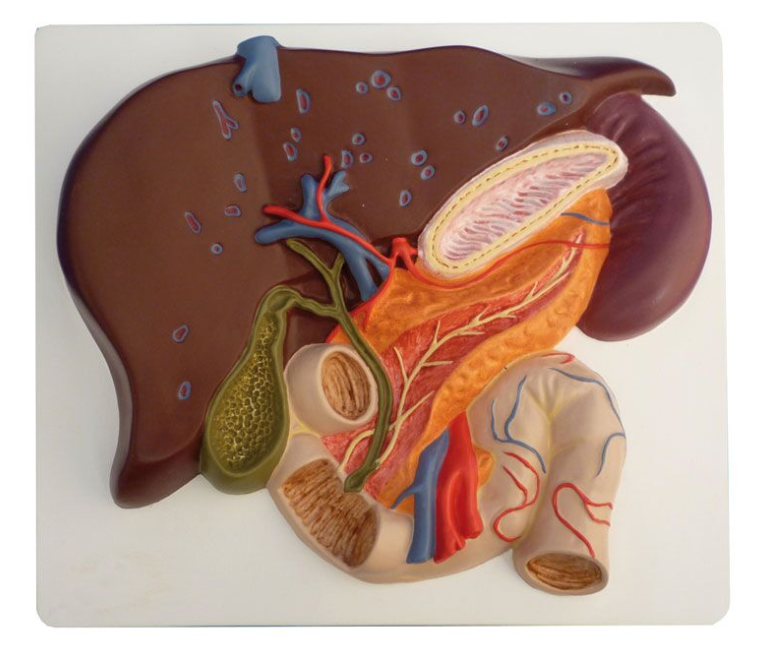 Model naturalnych rozmiarów przedstawiona na tablicy z zaznaczonymi w widoczne kolory organami. Wątroba z trzustką i dwunastnicą.