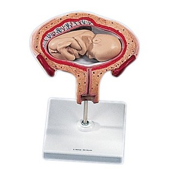 Realistyczny model przedstawiający płód człowieka w 5 miesiącu ciąży w pozycji pośladkowej. Płód można wyjąć z macicy w celu lepszego wglądu do jej wnętrza.