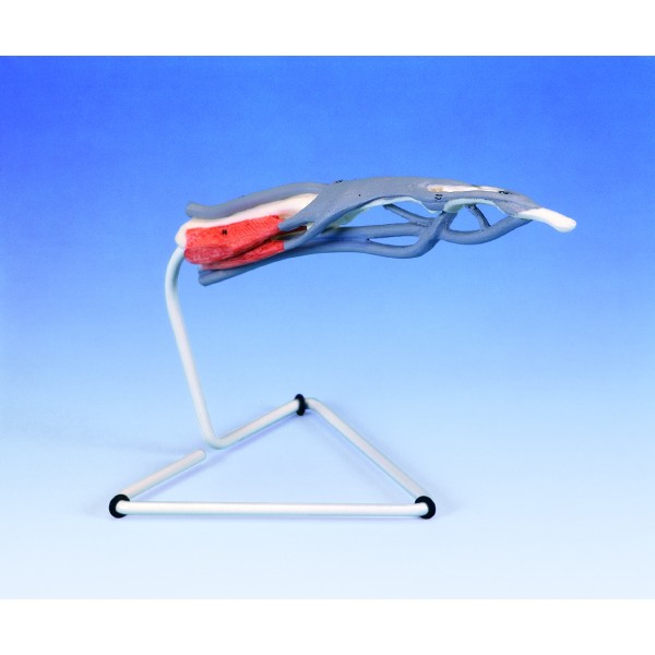 Model struktury wewnętrznej palca przedstawia: kości, mięśnie i ścięgna środkowego palca. Model dostarczany z drucianą podstawką.