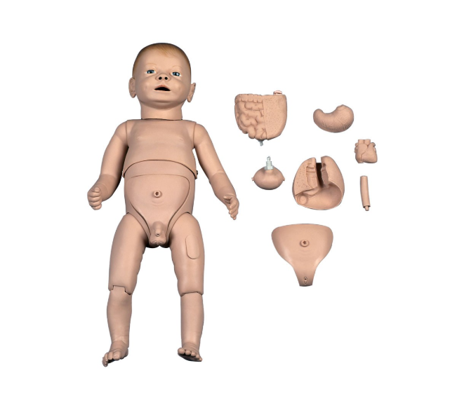 Model pielęgnacji noworodka do ćwiczenia zabiegów pielęgnacyjnych noworodków, dwupłciowy, z narządami wewnętrznymi. Dzięki naturalnym wymiarom oraz wadze, a także ruchomym stawom, pomocny w nauce podstawowych czynności pielęgnacyjnych, takich jak zmiana pieluszki, karmienie, mycie, czyszczenie oczu, uszu i nosa, pielęgnacja pępowiny.