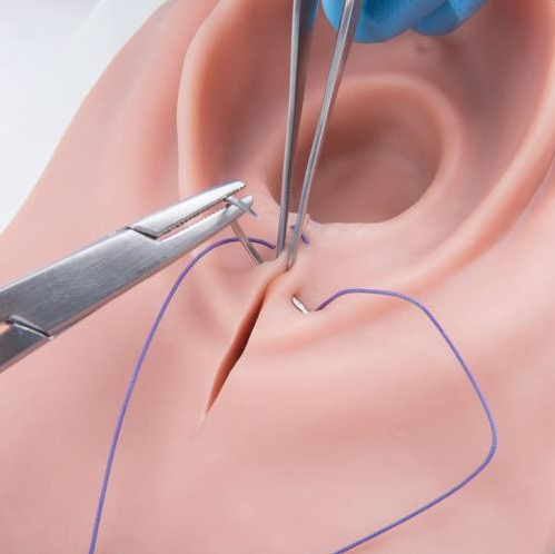 Każde cięcie można zszywać wielokrotnie. Symulator wykonany z realistycznego materiału, ponadto łatwo utrzymać go w czystości. Regulowany stojak jest stabilny, ponadto dobrze trzyma się podłoża. Wkładka wyjmowana ze stojaka, istnieje możliwość dokupienia także zapasowych sztuk.