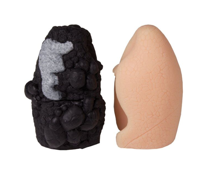 Model zmian potytoniowych umożliwia porównanie płuc osoby palącej i niepalącej, gdzie zdrowe płuco jest w kolorze różowym, bez patologii, a palącej w kolorze czarnym.