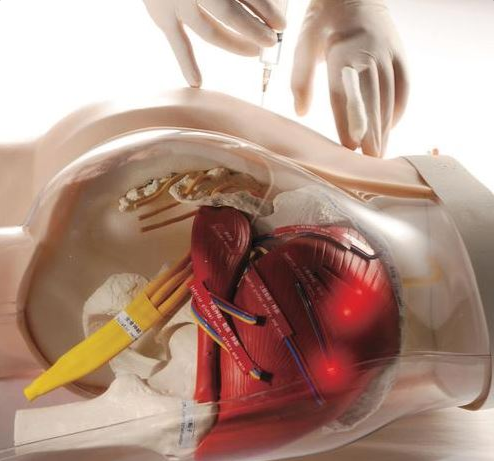 Symulator iniekcji domięśniowych z sygnalizacją świetlną i dźwiękową. Prawa strona pod przezroczystą warstwą skórną ukazuje struktury kostne, lewy pośladek służy do praktycznego treningu iniekcji.